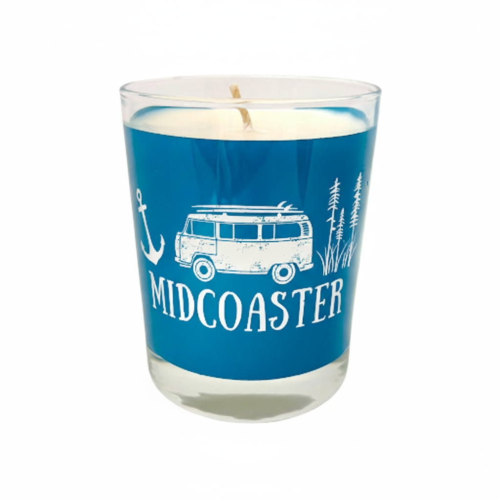 Inspired by a life on the coast, our Midcoaster candle perfectly captures the spirit of Midcoast Maine. The vessel's design features an anchor and a vintage surf van, ready for a coastal adventure.